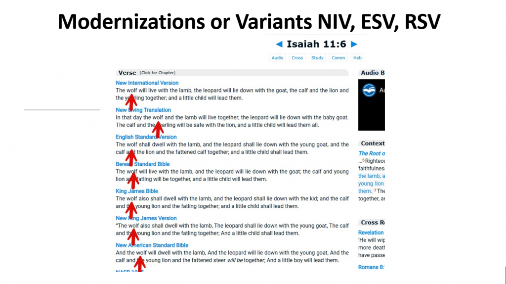 We have shown the evidence for this one example of Isaiah 11:6, but it is true of you look at any of the questions in our survey. They are the same in every version and in the orginal manuscripts from which they were derived.