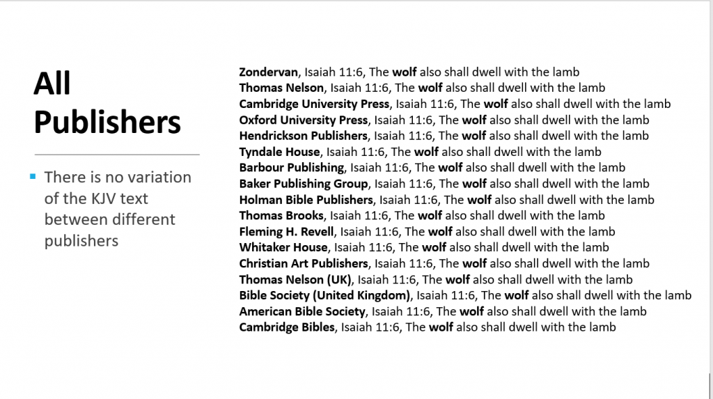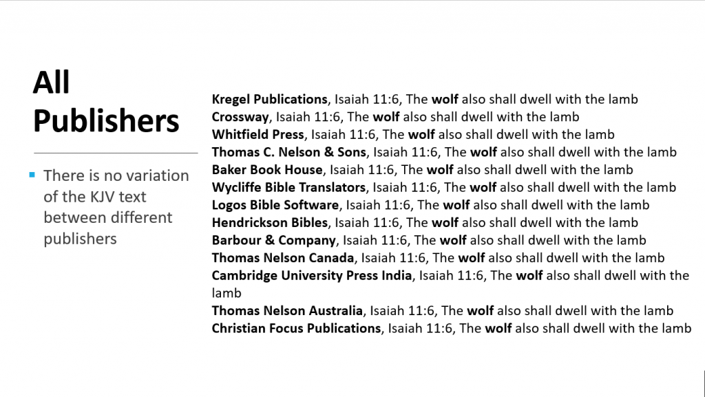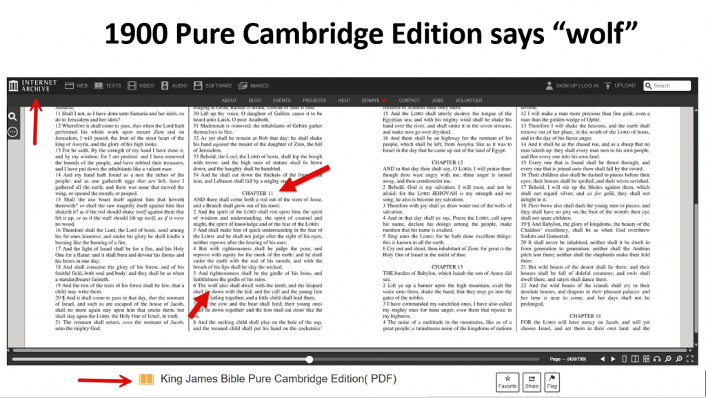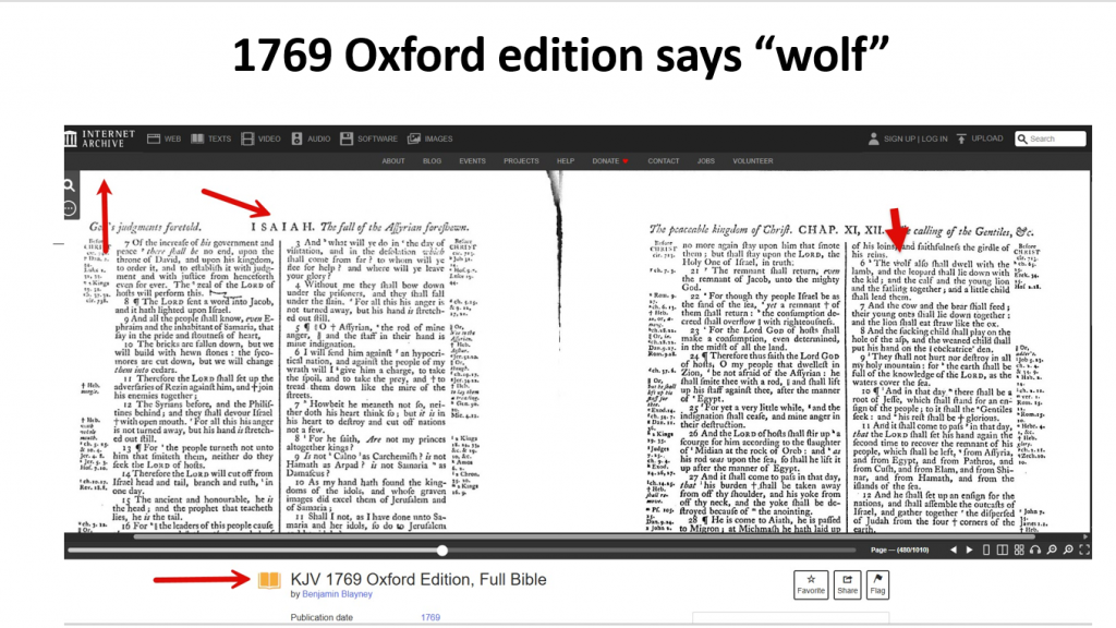 The image shows that all versions including the KJV say "wolf" and not "lion." In our national pastor's survey of Isaiah 11:6, 23 out of 31 pastors (74%) chose "the lion" but what appears in every version is "the wolf." So if it's the same in every version, how could they have been confused by different versions?