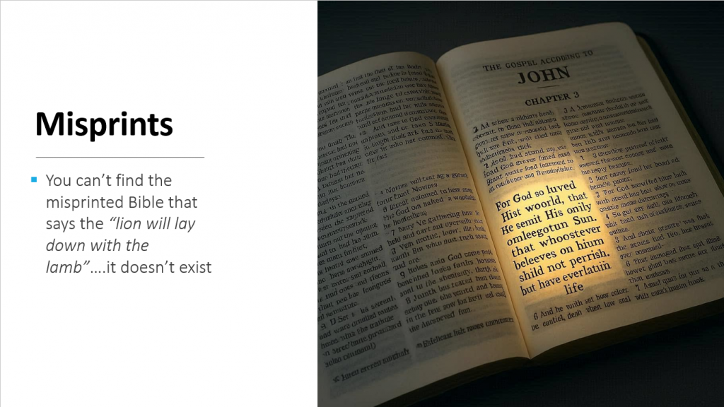 The hypothosis that misprints could be the explanation for our pastors survey is a desperate fantasy. You cannot find a misprinted Bible that says "the lion will lay down with the lamb," and you certanly can't find a Bible that has all twelve of the passages that the pastors misremembered. And if you did, how would you convince anyone that this misprinted Bible is ubiquitous enough to account for the worldwide unified misremembering that we have documented.