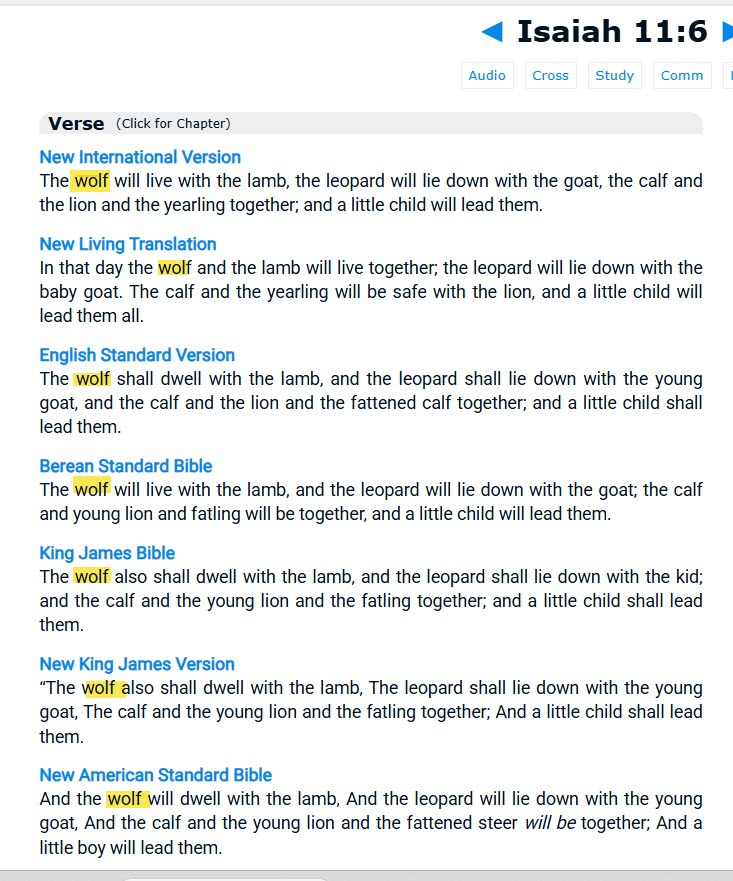 We agree that all publications have always said "wolf" in this timeline, we simply disagree that the timeline that we are now in is the one that we've lived through all of our lives. Discussion of the "wolf" in Isaiah 11:6 in Matthew Henry's commentary is not proof that the Bible hasn't changed, it's only proof that you have no concept of how exotic this phenominon is.